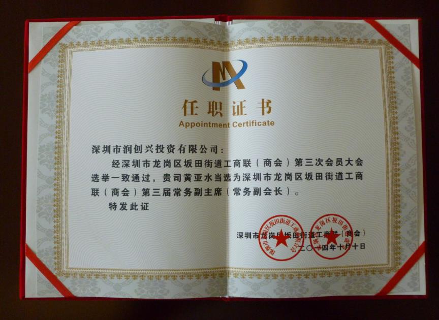 擔任深圳龍崗區(qū)坂田街道工商聯(lián) 第四屆常務副會長