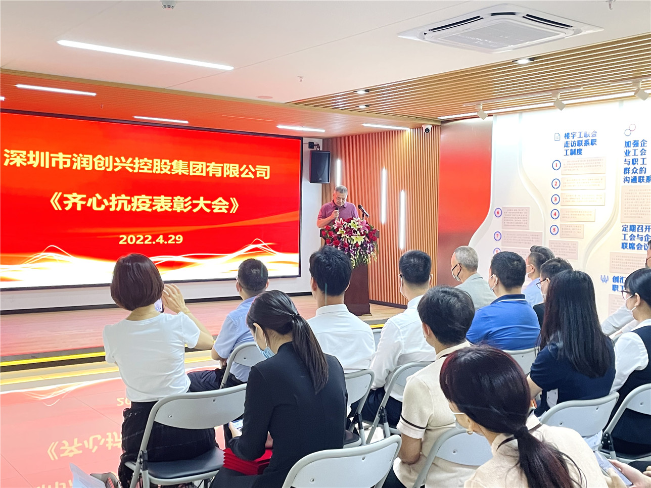 2022年4月29日下午15點,在創(chuàng)匯國際中心21樓舉行“深圳市潤創(chuàng)興控股集團(tuán)有限公司齊心抗疫表彰大會“。潤創(chuàng)興集團(tuán)公司董事長黃亞水、總經(jīng)理吳椰軍、副總經(jīng)理張海波、副總經(jīng)理羅勇、總助黃輝及集團(tuán)總部和下屬公司員工參加了本次表彰大會。