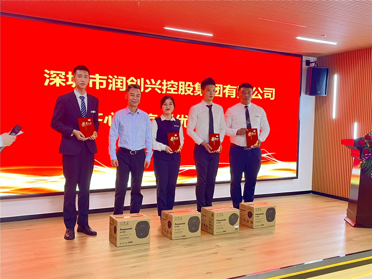 接著,頒發(fā)《優(yōu)秀團(tuán)隊貢獻(xiàn)獎》,獲獎單位:潤創(chuàng)興時代管理處、創(chuàng)匯大廈管理處。由集團(tuán)公司吳椰軍總經(jīng)理為獲獎單位頒發(fā)獎牌。優(yōu)秀團(tuán)隊成員33人,獎品為價格318元的食品日用品大禮包,在會后發(fā)放;