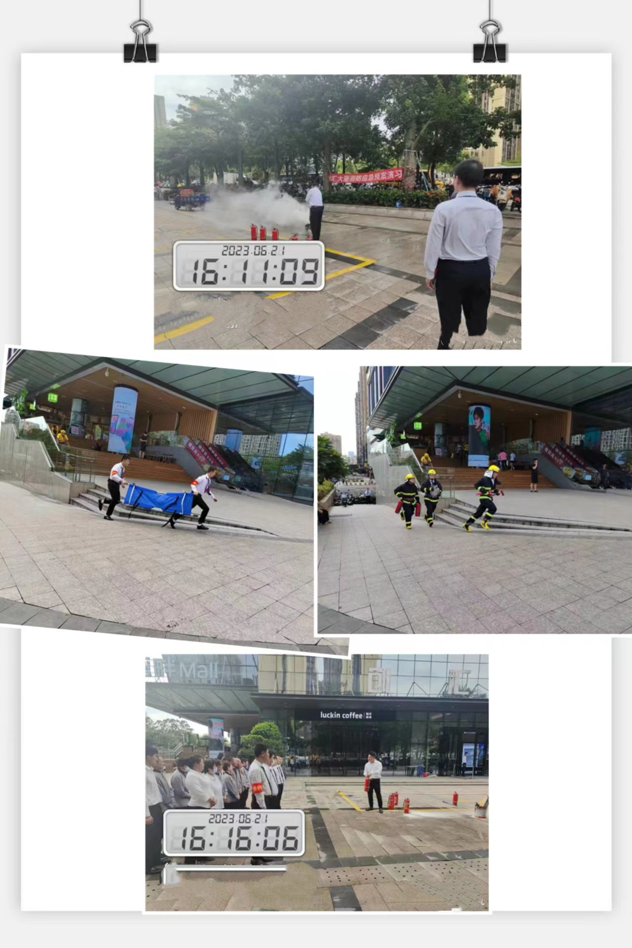 下午16:00時(shí),隨著警報(bào)聲響起,消防控制室值班人員發(fā)現(xiàn)火情后,立即進(jìn)行上報(bào),同時(shí)迅速撥打“119”報(bào)警和“120”急救電話。設(shè)備組工作人員馬上切斷火災(zāi)區(qū)電源,關(guān)閉電梯,啟動(dòng)應(yīng)急照明;疏散組人員組織員工進(jìn)行緊急疏散,指揮大家用濕毛巾捂著口鼻,沿著逃生通道彎腰快跑,避免摔倒造成踩踏。滅火組人員根據(jù)火情,啟動(dòng)消火栓,打開消防水帶和滅火器,對(duì)著火點(diǎn)進(jìn)行撲救;控制火勢(shì)蔓延,同時(shí)拉起警戒線,禁止非專業(yè)人員進(jìn)入火場(chǎng)。救護(hù)組人員準(zhǔn)備好擔(dān)架,隨時(shí)準(zhǔn)備進(jìn)行傷員救護(hù);疏散組人員帶領(lǐng)大家撤到安全地點(diǎn)后,馬上進(jìn)行人員清點(diǎn),確保每一位員工都已安全撤出,并第一時(shí)間向總指揮匯報(bào)人員安全撤離情況。整個(gè)演習(xí)過程各小組分工明確,聽從指揮、行動(dòng)迅速、銜接緊密,配合到位。本次消防演習(xí)用時(shí)1小時(shí),通過模擬火情,撥打急救電話、關(guān)閉火災(zāi)區(qū)電源、電梯停運(yùn)、啟用應(yīng)急照明、人員疏散、傷員救護(hù)、滅火撲救等環(huán)節(jié)演練;不僅提高了員工消防安全意識(shí),幫助員工熟練掌握消防設(shè)備操作方法,同時(shí)也檢驗(yàn)了和潤居物業(yè)創(chuàng)匯大廈管理處消防應(yīng)急處理反應(yīng)能力。