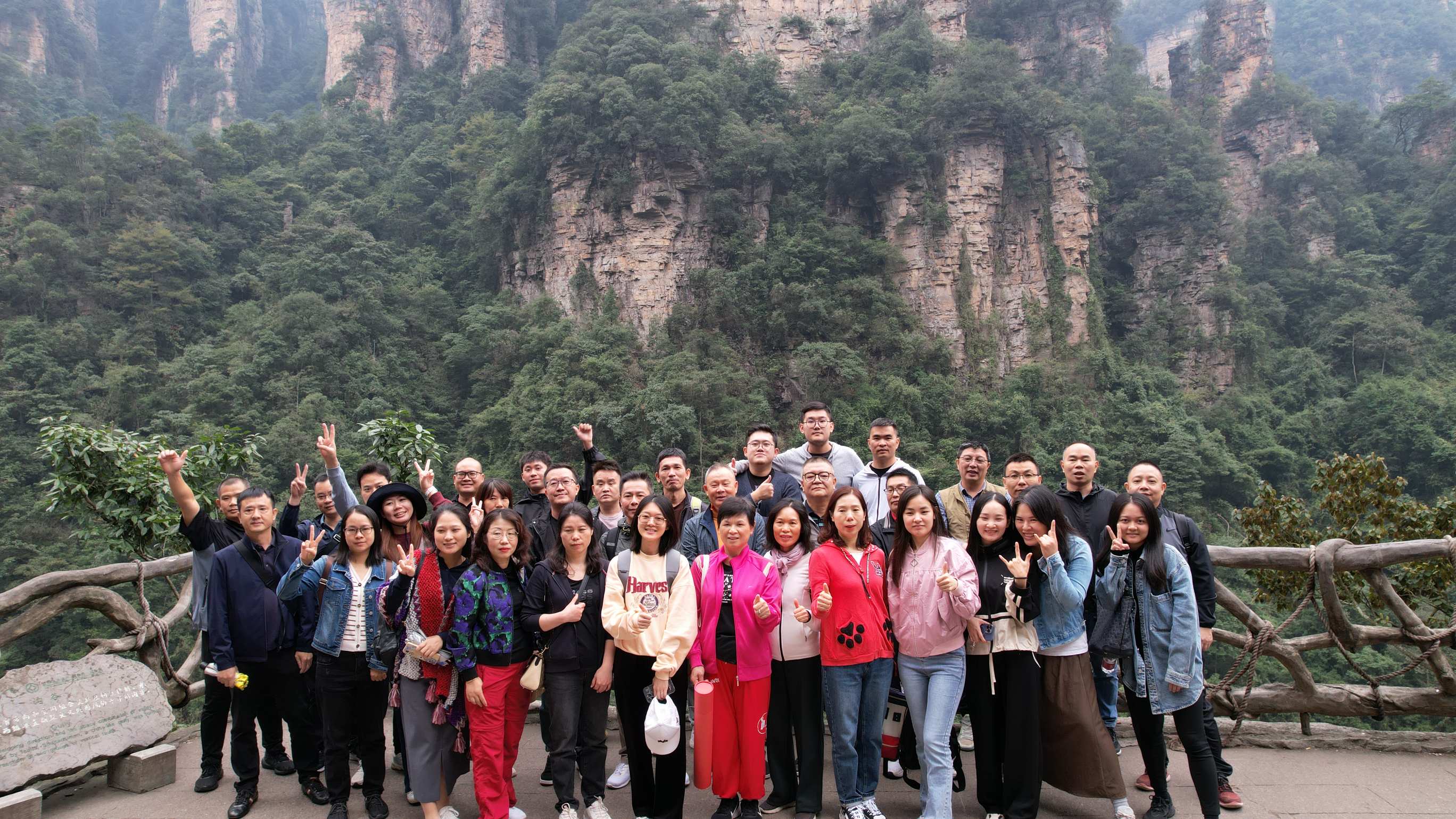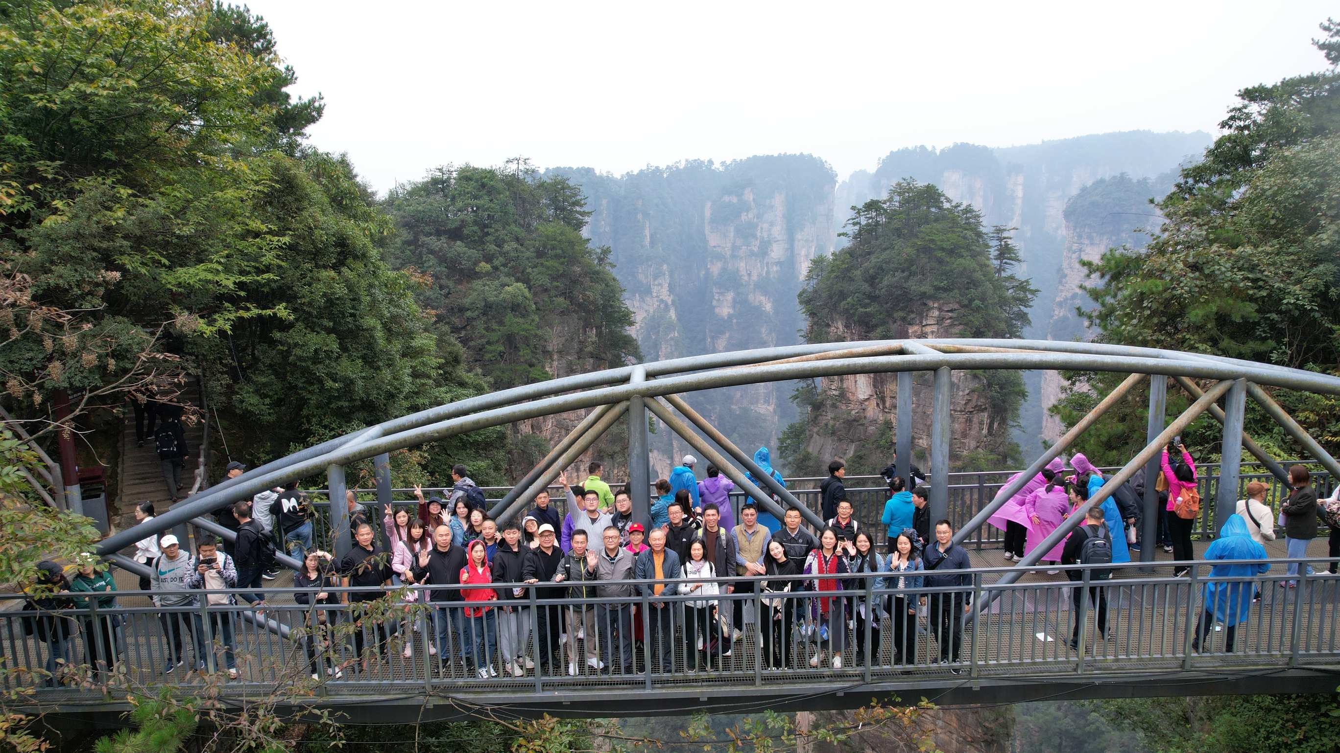 今天大家乘坐張家界國(guó)家森林公園天門(mén)索道——世界最長(zhǎng)的單線循環(huán)脫掛抱索器車(chē)廂式索道。索道線路斜長(zhǎng)7455米,上、下站水平高差1279米,坐在索道車(chē)廂里,隨著高度的高升,身邊云霧籠罩,有種直入云霄的感覺(jué)。有了大峽谷玻璃橋的體驗(yàn),今天大家都能輕松走過(guò)懸浮在懸崖峭壁上玻璃棧道。站在山頂,俯看”天下第一公路奇觀”被稱(chēng)為通天大道的盤(pán)山公路。大家參觀了天門(mén)洞,感受天門(mén)洞前九百九十九級(jí)臺(tái)階,登上天梯的感覺(jué)。