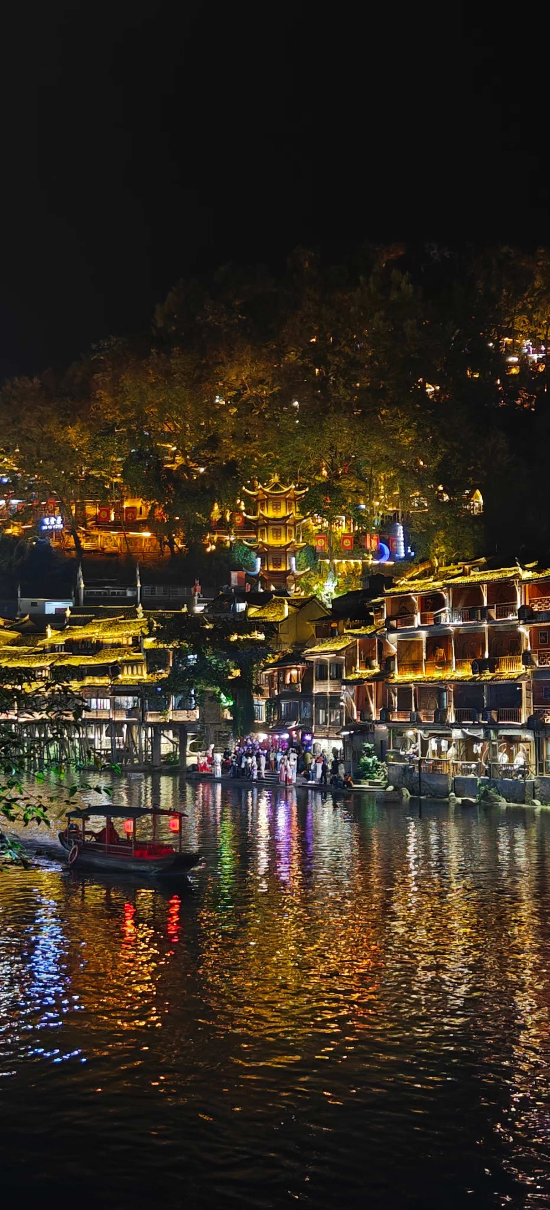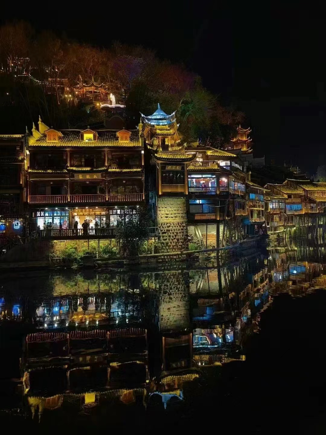 夜晚的鳳凰古城,千燈萬(wàn)火,光影籠罩,與天上星月相輝映,沱江兩岸璀璨逶迤數(shù)里,紅色城墻、灰色古建筑、吊腳樓、古橋、流水、古街深巷、燈火、穿著苗族服飾拍照的姑娘等,猶如一幅幅畫(huà)卷,展示著古城的美麗。在臨街而駐的店鋪,曲徑通幽的長(zhǎng)街深巷,到處是摩肩接踵的人群,大家沉浸在光采絢麗的夜景中,流連忘返。